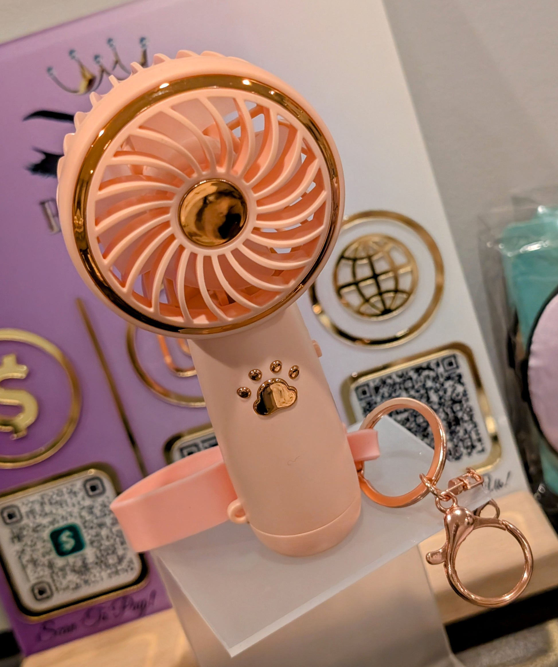 Enhance your eye lash game with our new Mini Lash Fans. No more watery eyes, thanks to its powerful yet compact design. Easily charge with its USB charger and take it anywhere with the included wristlet. Stay cool and beautiful with this cute and efficient fan. (Light Pink)